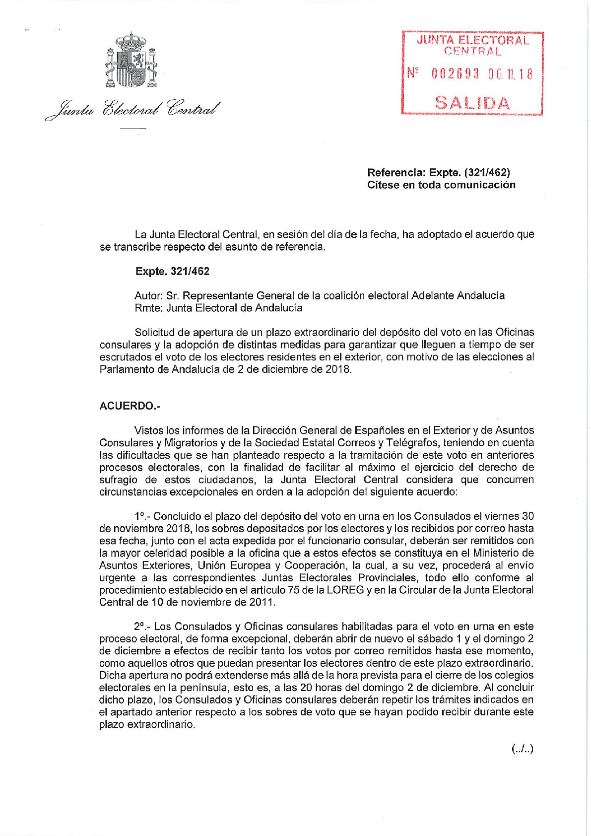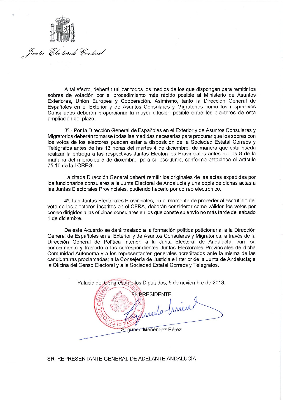 Por último, en el caso de los andaluces en el exterior que opten por el voto mediante correo a las oficinas consulares, la Junta Central, tal como solicitó Adelante Andalucía, ha resuelto que las Juntas Electorales Provinciales deberán admitir como válidos aquellos votos emitidos como muy tarde hasta el sábado 1 de diciembre.